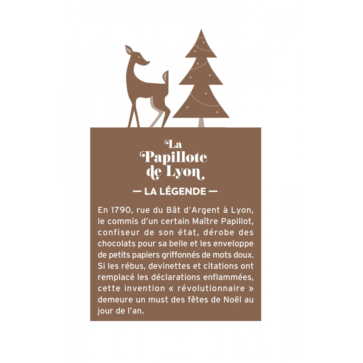 En 1790, rue du Bat d'Argent à Lyon, le commis d'un certain Maitre Papillote, confiseur de son état, dérobe des chocolats pour sa belle et les enveloppe de petits papiers griffonés de mots doux.