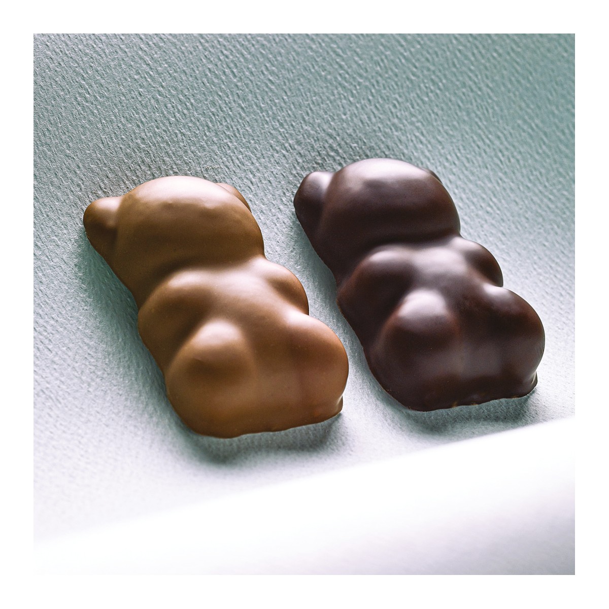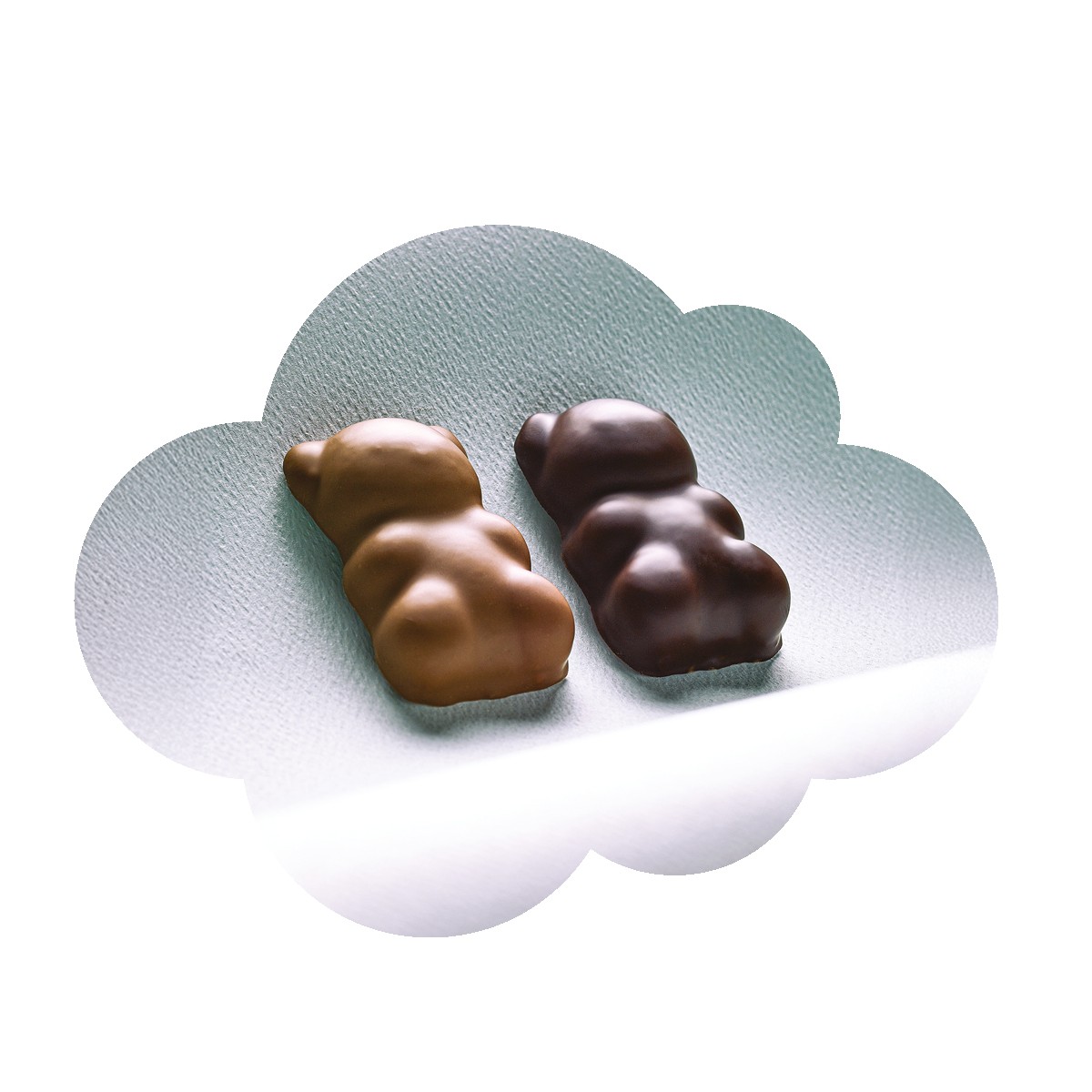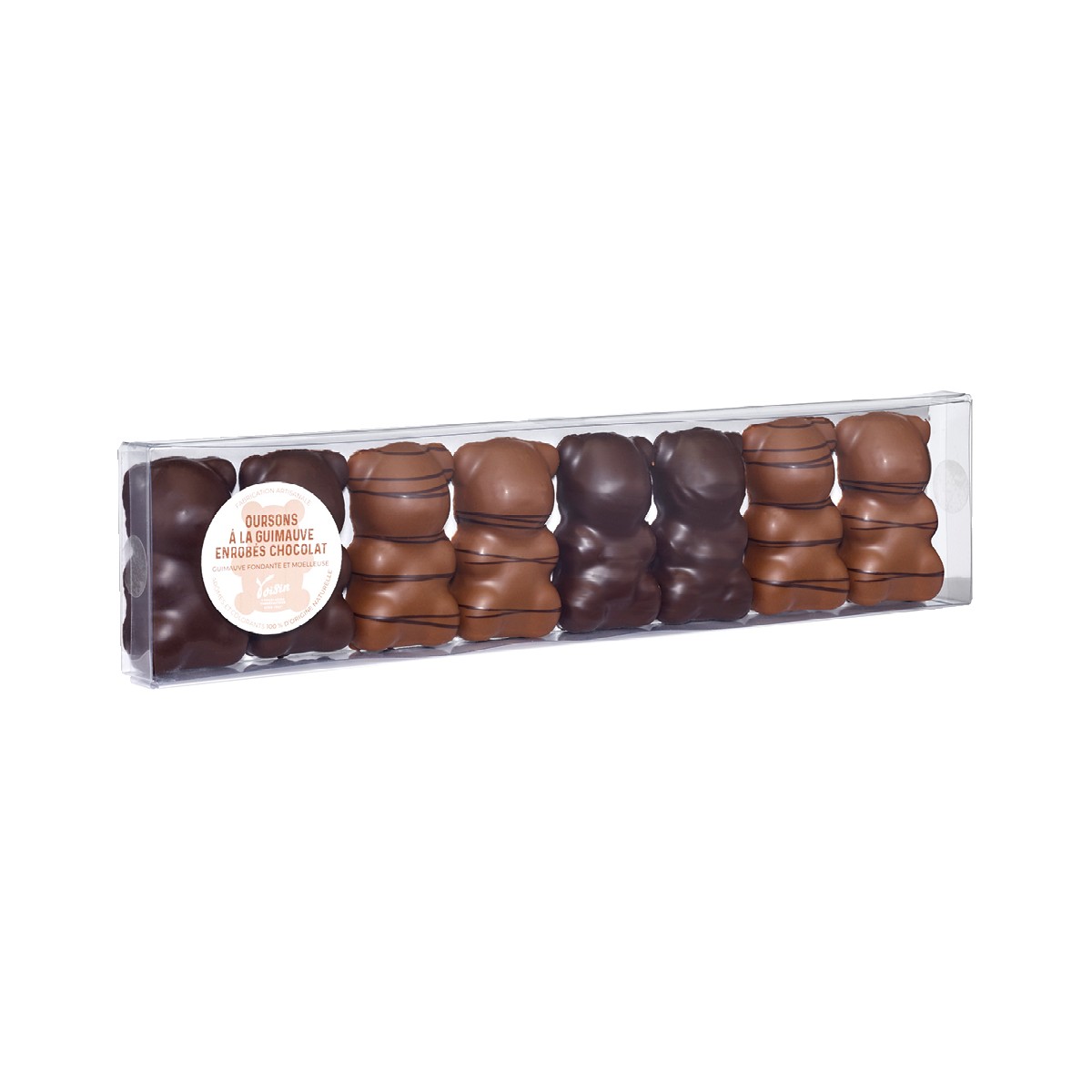 Etui de 8 oursons, 4 oursons guimauve à la vanille de Madagascar enrobés de chocolat au lait et oursons guimauve framboise enrobés de chocolat noir.