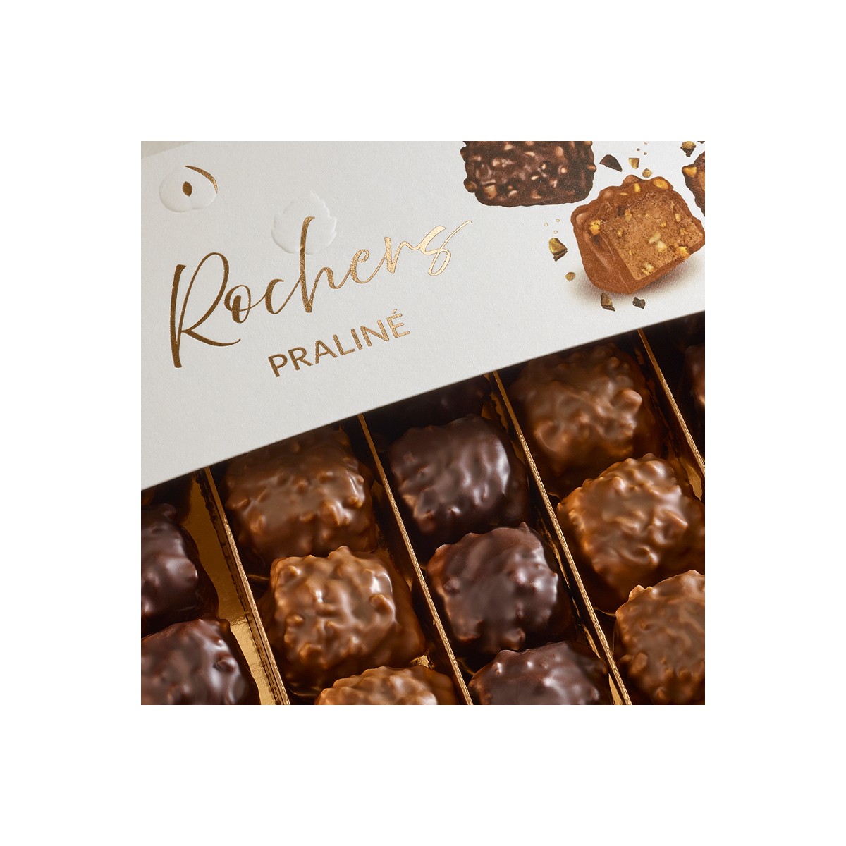 Le véritable Rocher praliné Malakoff. Praliné pur noisette aux éclats de noisettes torréfiées du Piémont, douceur du chocolat au lait et force du chocolat noir.