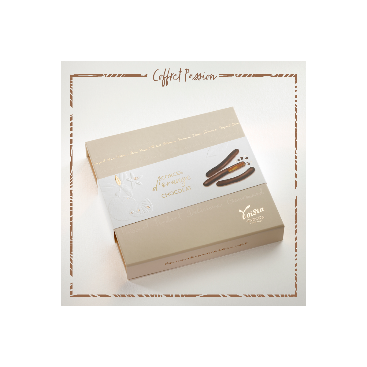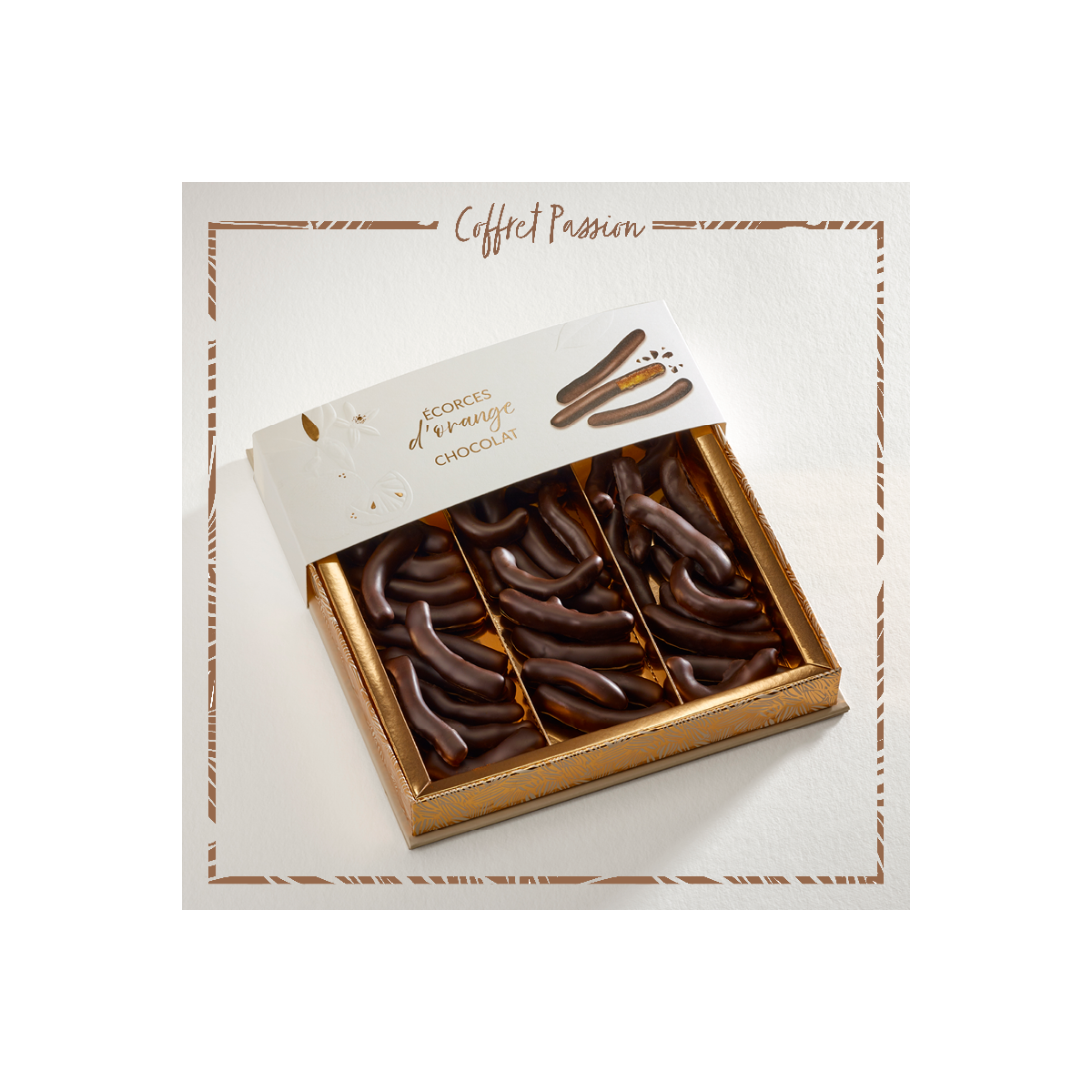 Cueillies à maturité, les oranges Navel dévoilent une écorce gorgée de soleil. Lentement confites à cœur, elles libèrent des notes suaves et acidulées. Enrobées avec délicatesse d’un chocolat noir intense aux origines nobles, elles fondent en bouche dans un jeu de textures et d’arômes. L’éclat fruité de l’agrume mêlé à la profondeur du cacao offre une caresse vibrante, un frisson gourmand pour les sens.