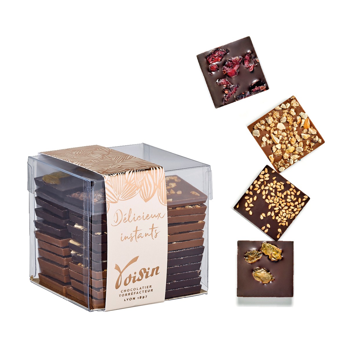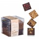 Assortiment gourmand de carrés de chocolat noir intense 70% de grandes origines ou de chocolat au lait 36% agrémenté d'inclusions des meilleures origines du monde de fruits secs ou de supers fruits