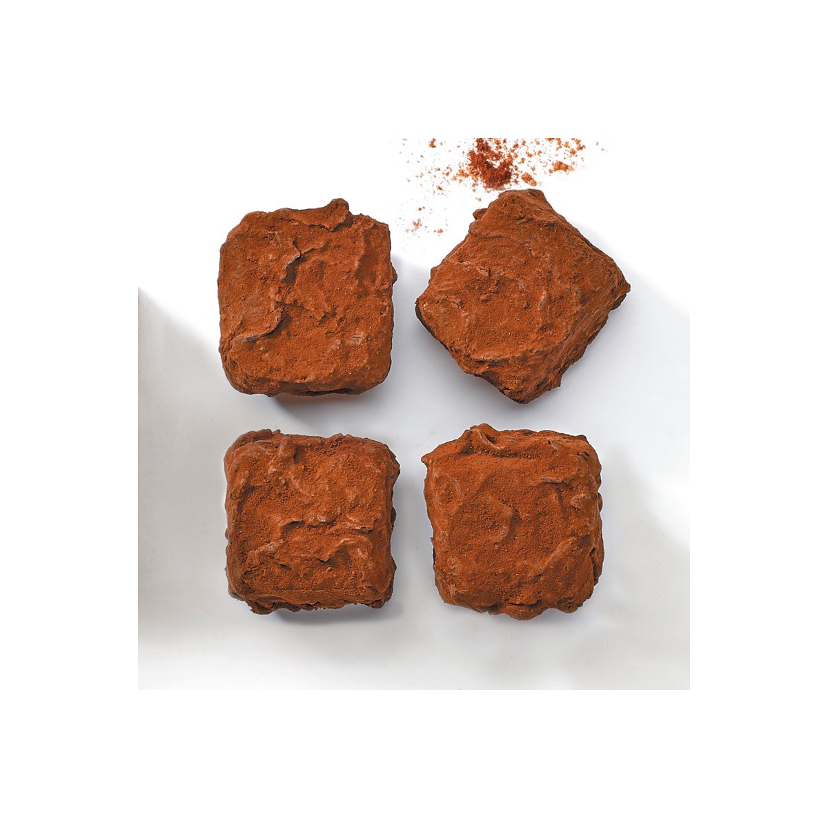 Enrobée d'une fine poudre de cacao, la craquante couverture intense noire 70 % recèle une exceptionnelle ganache, puissante et onctueuse, élaborée à base de crème fraîche fleurette de Normandie et des meilleures origines de cacaos d’Amérique Latine (Équateur, Mexique).