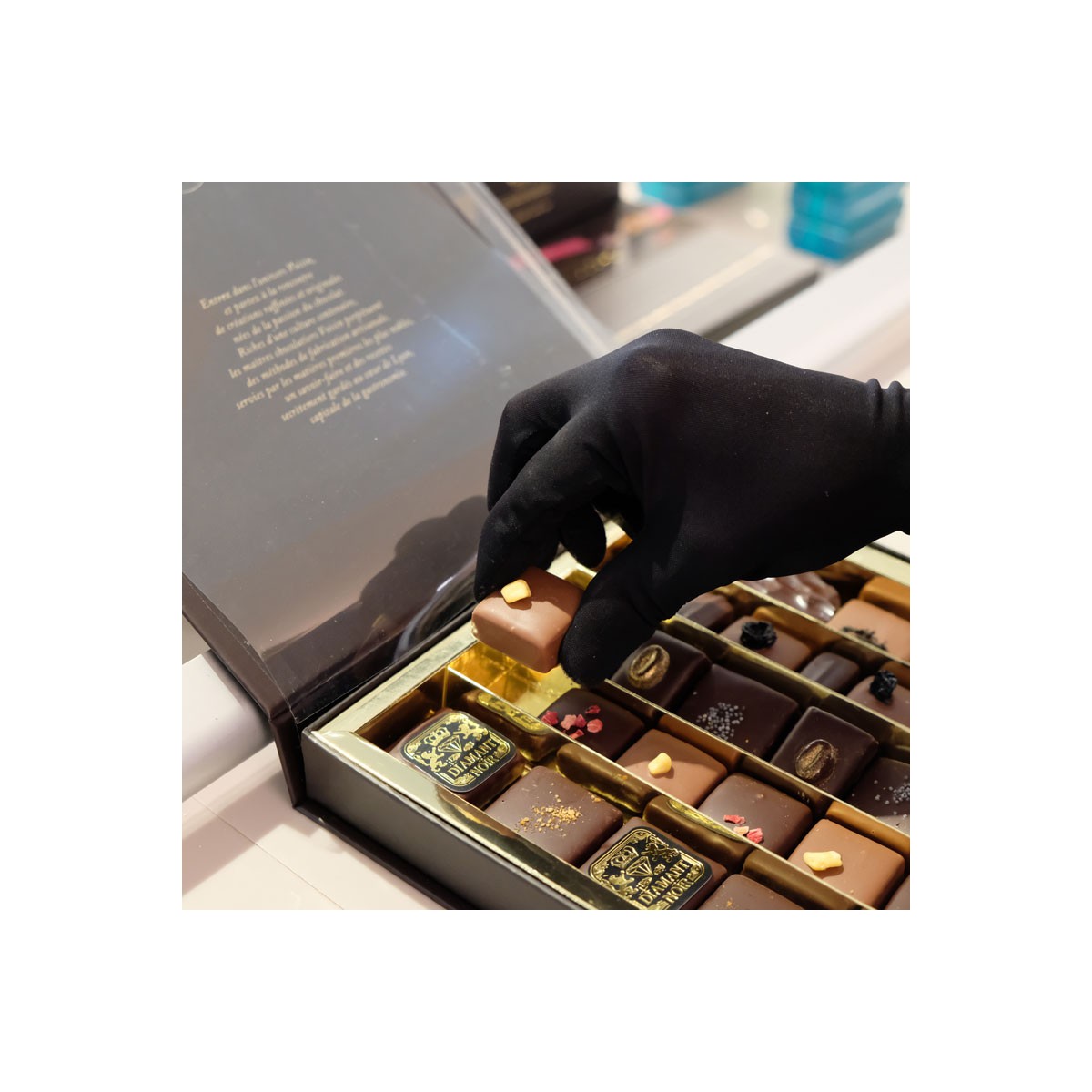 Fruit du savoir-faire artisanal d'excellence de nos maîtres chocolatiers, notre collection de chocolats fins est fabriquée dans le respect des recettes authentiques de la haute chocolaterie française. Nos ganaches noires 70% sont élaborées à partir des meilleures origines de cacaos (Venezuela, Equateur, Mexique, Cuba, Madagascar), nos pralinés à l'ancienne, fondants ou croustillants, sont fabriqués à partir d'amandes et de noisettes d'exception, broyées sur meule granit.