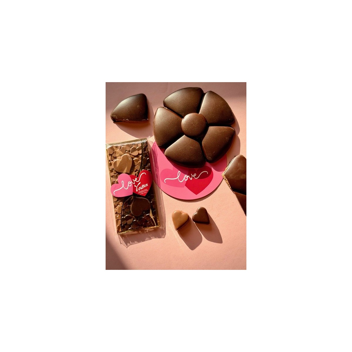 Tablettes cœur en chocolat noir et lait, coffrets et créations originales composent cette collection exclusive, dont la fleur emblématique Pétales d’Amour : un chocolat noir 70 % renfermant un cœur fondant de praliné gianduja.