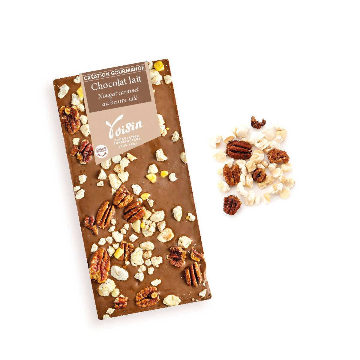 Chocolat au lait alliant le croquant des noix de pécan grillées à la douceur du nougat et la gourmandise du caramel beurre salé