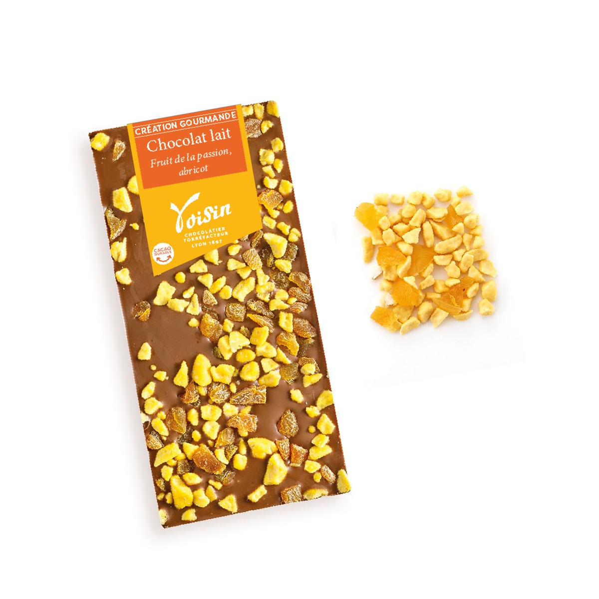 Chocolat au lait au goût acidulé des fruits de la passion et douceur de la pulpe d'abricots.