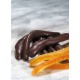 Alliance gourmande de savoureuses pépites d'écorces d'orange d'Espagne confites maison et d'un grand chocolat noir 70% de dégustation, fruit des meilleures fèves de cacao d'Amérique latine.